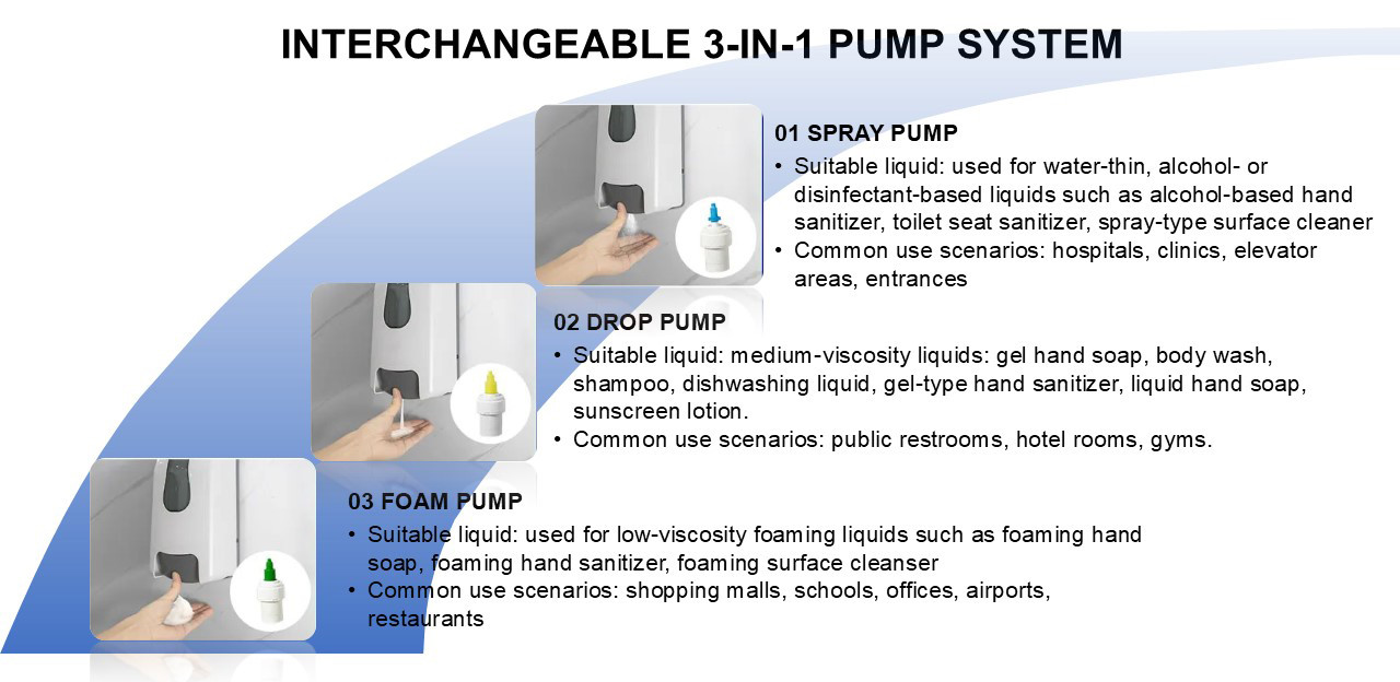 Three-in-one pump solutions for maximum market reach: our dispensers feature spray, drop, and foam pumps to handle a wide range of liquids—from alcohol-based sanitizers to gel soaps and foaming cleansers. This all-in-one flexibility allows brands to extend their products across multiple environments—hospitals, hotels, offices, schools, malls, and more—without changing packaging. For liquid manufacturers and distributors, this means broader market coverage, simplified logistics, and increased sales potential. Partner with us to tap into diverse hygiene markets with one versatile solution.