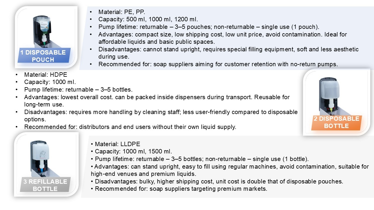 A. Refill bottle, Semi-rigid bottle and disposable pouch. The dispenser is compatible with foam, liquid and spray types-simply change the corresponding pump(valve) as needed.